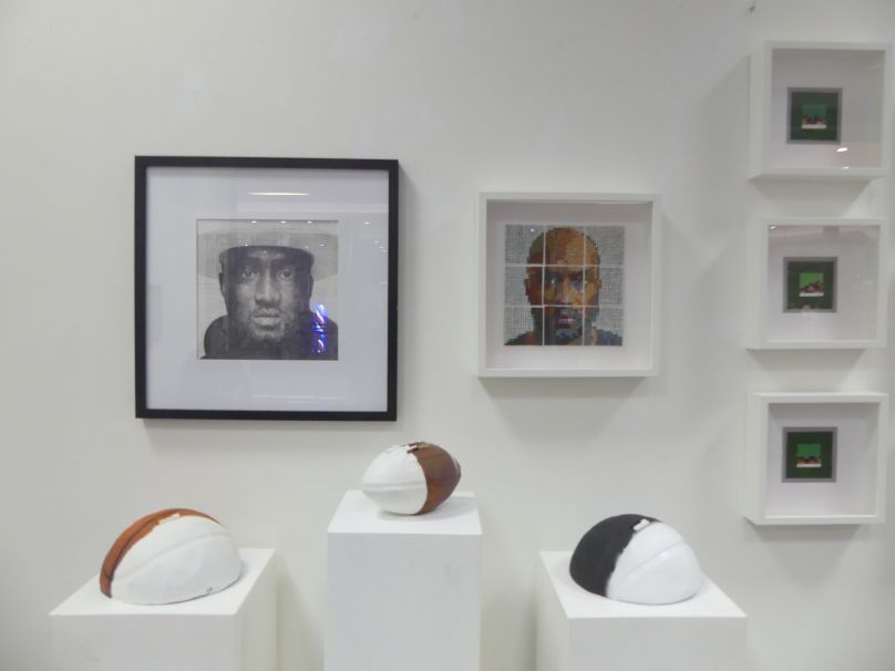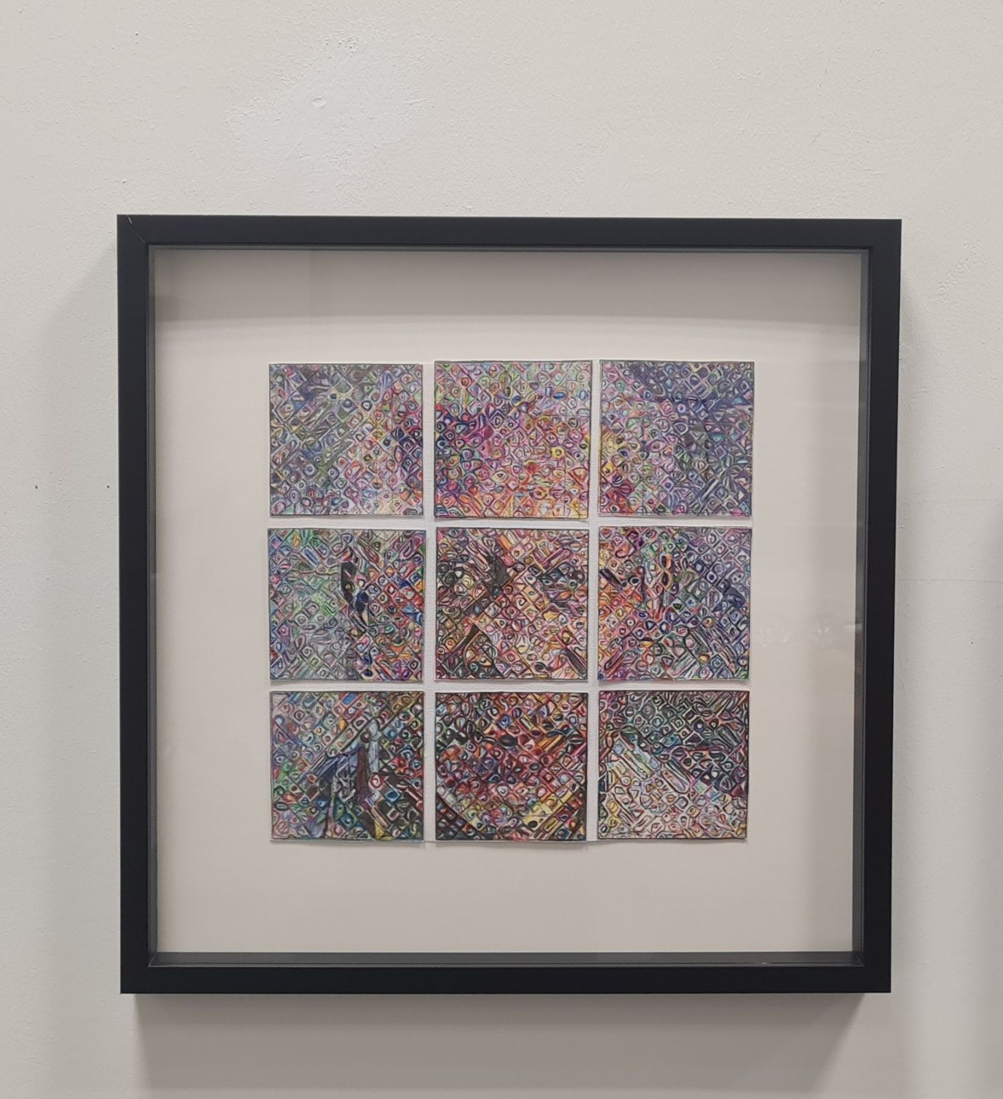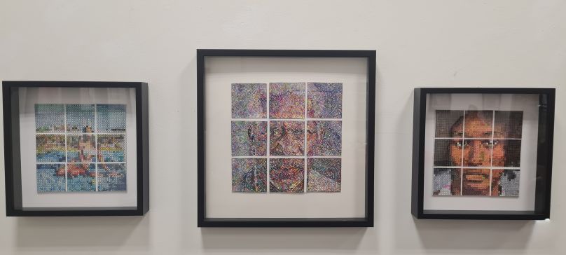 Phil Hansen: \"Das Fragment eines Fragments. - Es gibt viele Schichten der Verzerrung in diesem Stück. Die Person, die in diesem Werk eingefangen ist, ich selbst, wollte eine Vielzahl von Werken zeigen, daher zeigen die originalen Quadranten verschiedene Werke im Hintergrund. Die Hinzufügung der Pzllestücke macht die Identität der Figur fast zum Palimpsest. Dieser Dunst ist eine Vielfalt des Lebens, die ich in dieser Vitrine in meiner Hand halte.\" <\/p>\r\n