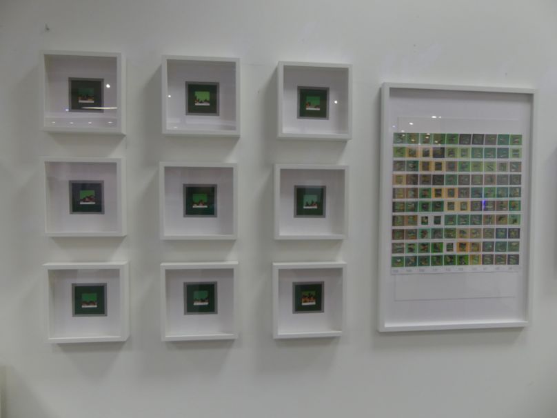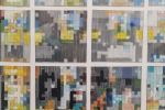 Phil Hansen: "Das Fragment eines Fragments. - Es gibt viele Schichten der Verzerrung in diesem Stück. Die Person, die in diesem Werk eingefangen ist, ich selbst, wollte eine Vielzahl von Werken zeigen, daher zeigen die originalen Quadranten verschiedene Werke im Hintergrund. Die Hinzufügung der Pzllestücke macht die Identität der Figur fast zum Palimpsest. Dieser Dunst ist eine Vielfalt des Lebens, die ich in dieser Vitrine in meiner Hand halte."