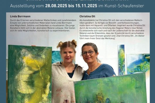 Christina Ott hat sich als Autodidaktin den verschiedenen Maltechniken genähert. Inspiriert wurde sie durch die künstlerische Anleitung des Hagener Malers Uwe Nickel. Es entwickelte sich ihre Leidenschaft für die abstrakte Malerei... Linda Borrmann fühlt sich ebenfalls in der abstrakten Malerei zuhause. Hier bieten sich ihr viele Möglichkeiten künstlerisch zu experimentieren...