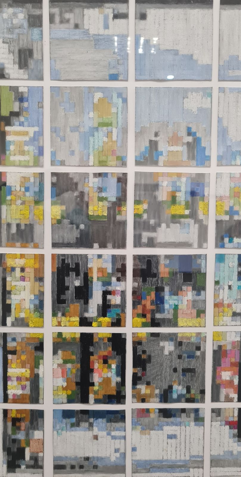 Phil Hansen: "Das Fragment eines Fragments. - Es gibt viele Schichten der Verzerrung in diesem Stück. Die Person, die in diesem Werk eingefangen ist, ich selbst, wollte eine Vielzahl von Werken zeigen, daher zeigen die originalen Quadranten verschiedene Werke im Hintergrund. Die Hinzufügung der Pzllestücke macht die Identität der Figur fast zum Palimpsest. Dieser Dunst ist eine Vielfalt des Lebens, die ich in dieser Vitrine in meiner Hand halte."